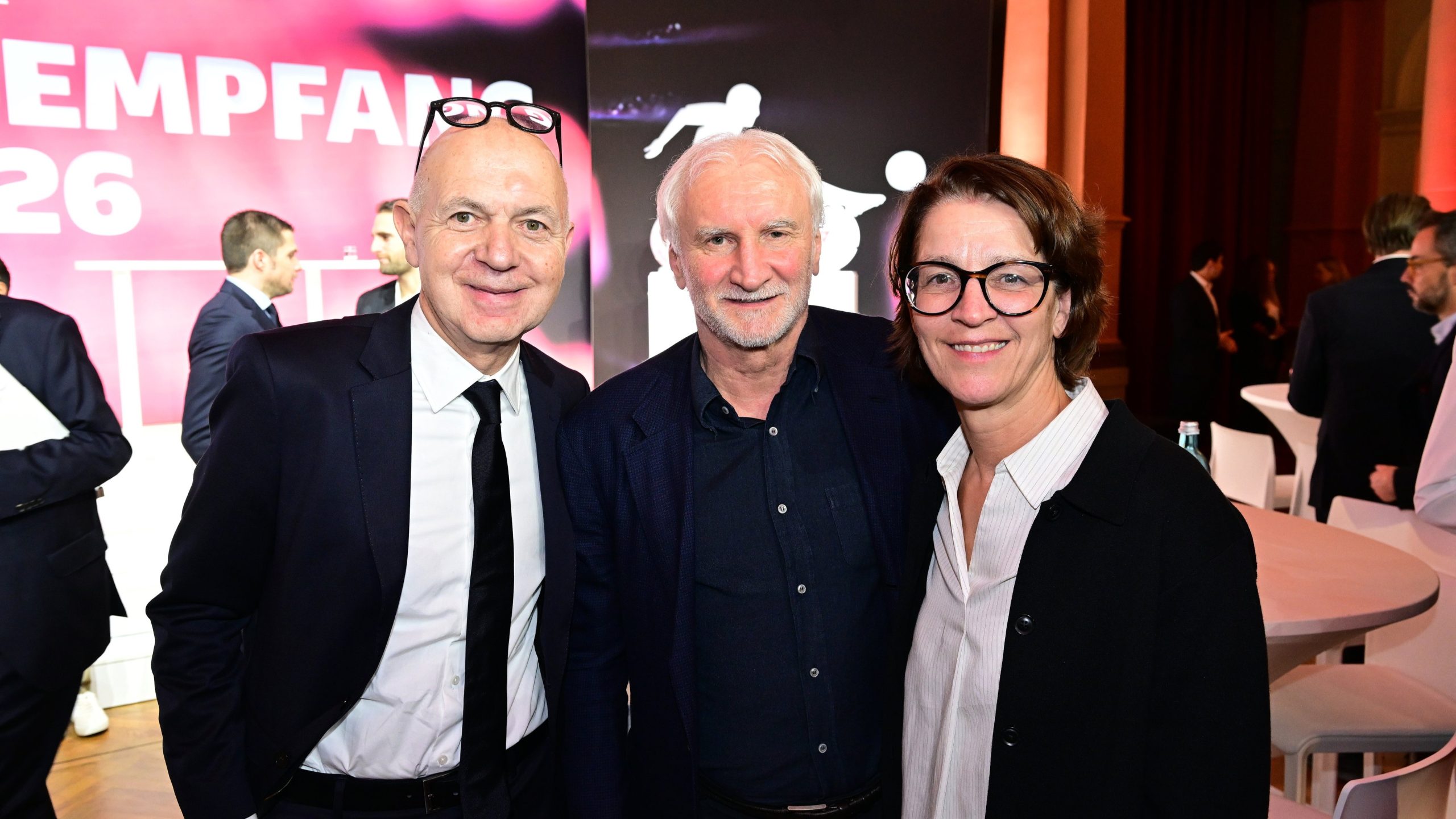 Von links: Bernd Neuendorf (DFB-Präsident), Rudi Völler (DFL-Ehrenpreisträger und DFB-Direktor A-Nationalmannschaft der Männer), Tatjana Haenni (Vorsitzende der Geschäftsführung RB Leipzig).