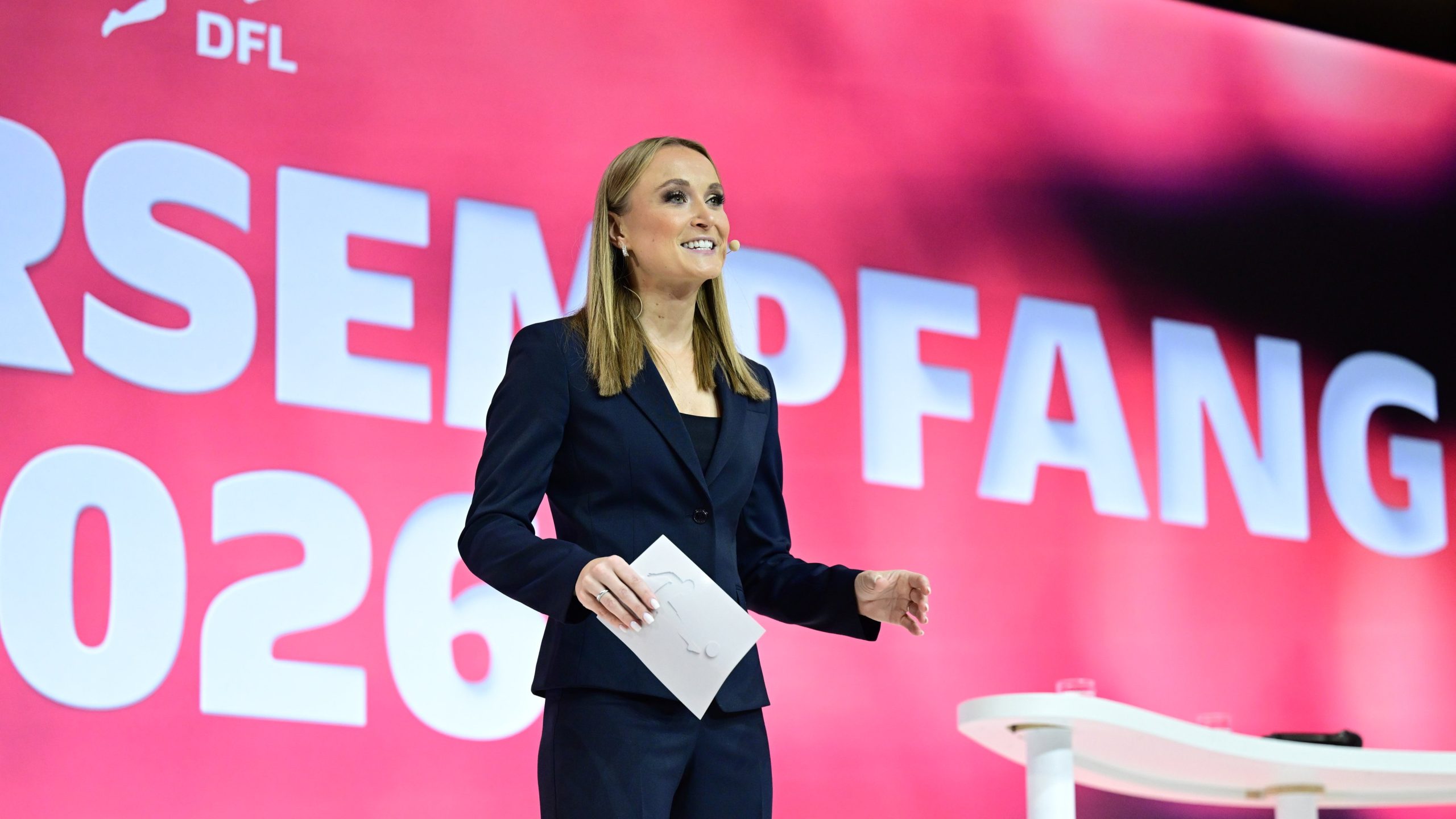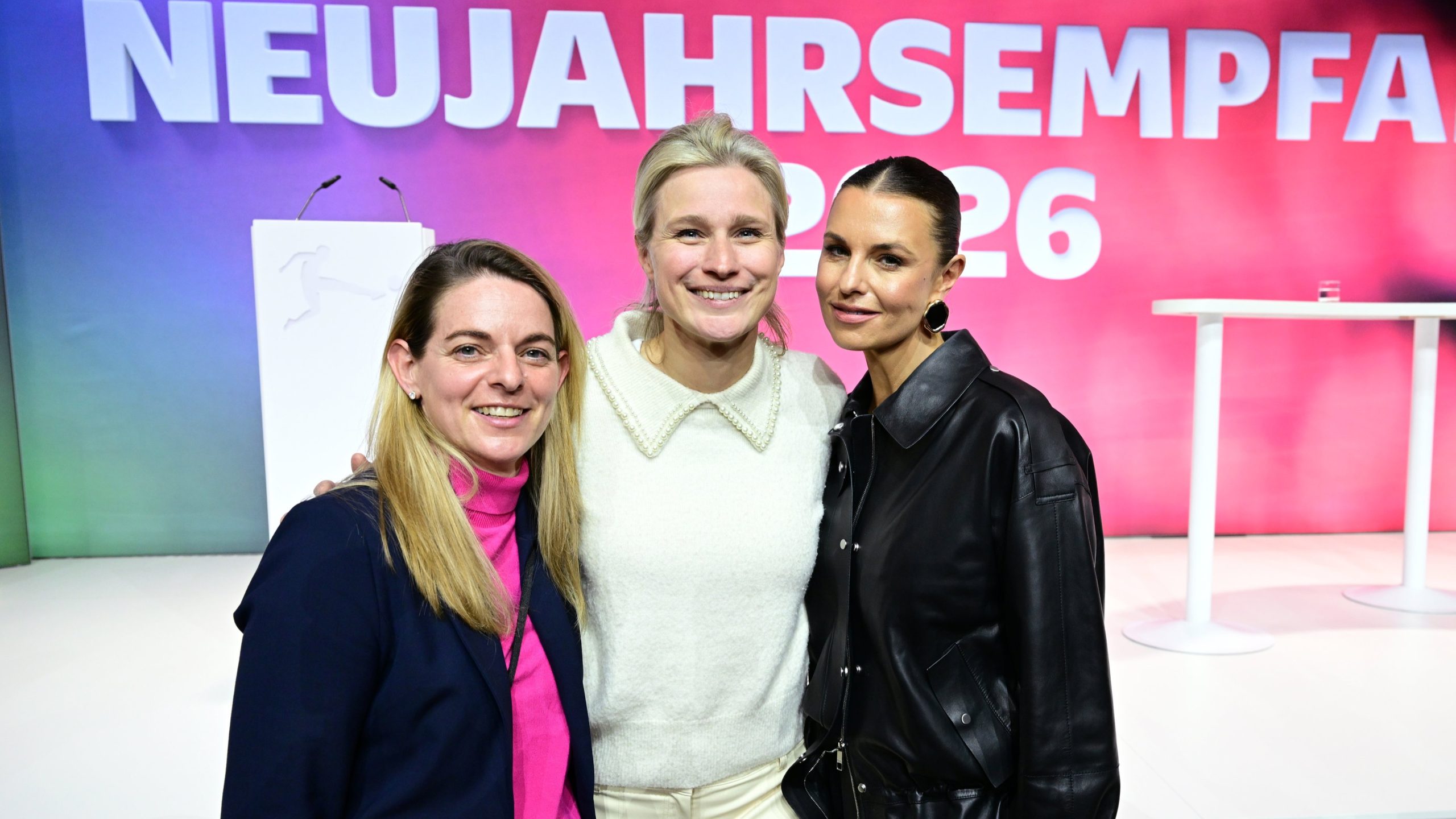Von links: Nia Künzer (DFB-Sportdirektorin Frauenfußball), Britta Heidemann (Kuratoriumsmitglied DFL Stiftung), Laura Wontorra (Moderatorin).